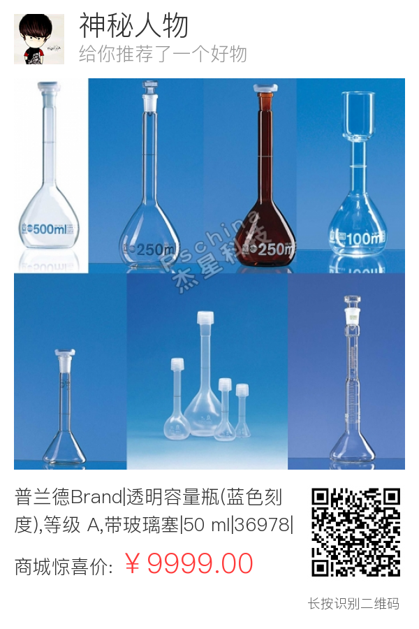 普兰德Brand|透明容量瓶(蓝色刻度),等级 A,带玻璃塞|50 ml|36978|BR36978