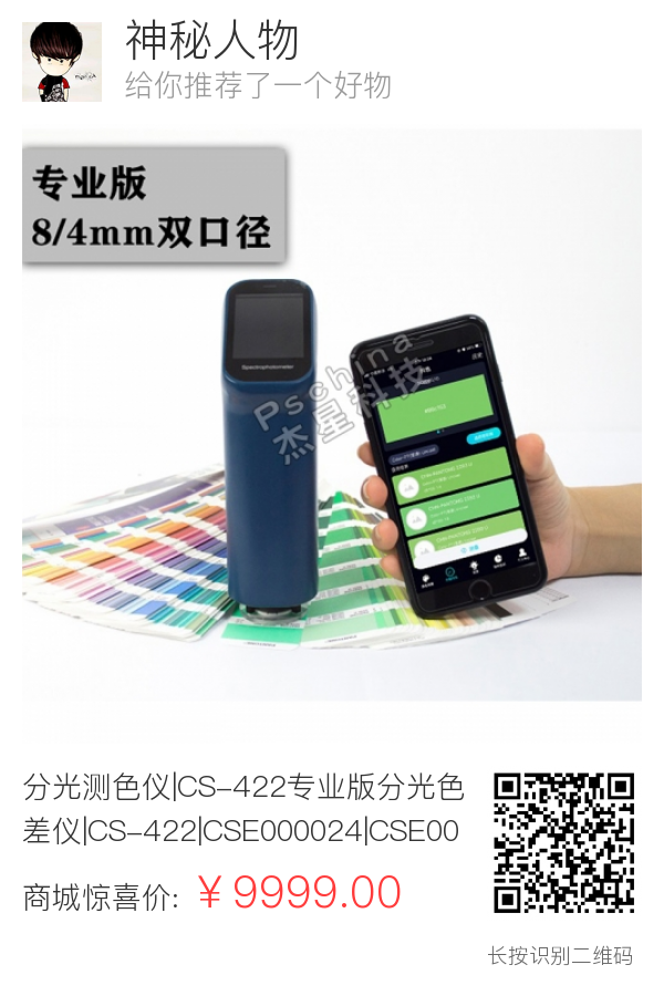 专业版分光色差仪CS-422开拓色差仪测色新技能;内置摄像头,想测哪里测哪里;配带UV光源,实现荧光色测量;连接手机APP,数据测量、存储不受限,多套色卡信息,随时随地查找相近色;还可使用APP进行配色、修色功能。CS-422型号支持支持口径切换,满足不同大小尺寸样品测量。